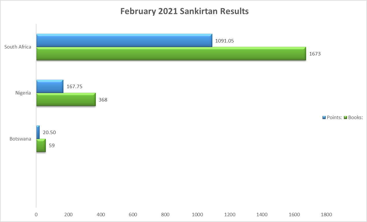 Please find below a summary of the Sankirtana Scores for February 2021 from the African Continent.