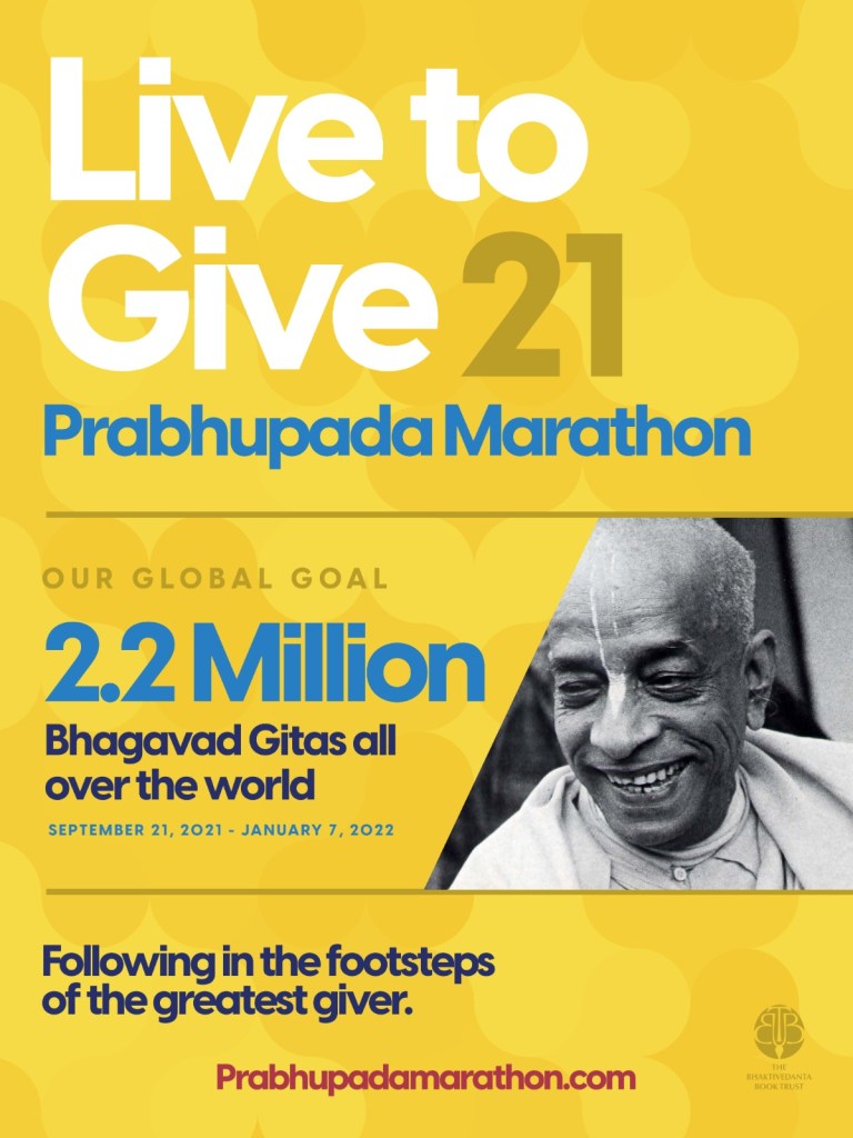 The Live to Give Campaign is a Campaign to distribute Bhagavad Gitas. It officially started on 21 Sep 2021 and will end on 7 Jan 2022.
