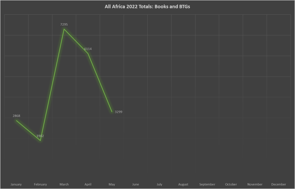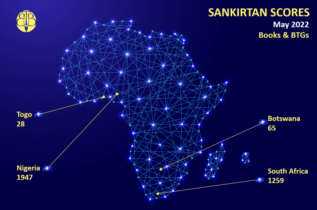 Sankirtana Scores - 2022Africa Sankirtana Scores – May 2022 Dear Devotees, Please find below a summary of the Sankirtana Scores for May 2022 from the African Continent. Please click on the download link for details per temple: Detailed Africa Sankirtana Results – May 2022Download nb: The April scores in the graph have been adjusted due to a correction from Nigeria. Rate this:Share this: Click to share on WhatsApp (Opens in new window) WhatsApp Click to email a link to a friend (Opens in new window) Email TweetMore Click to print (Opens in new window) Print Click to share on Reddit (Opens in new window) Reddit Share on TumblrLike Loading... Related