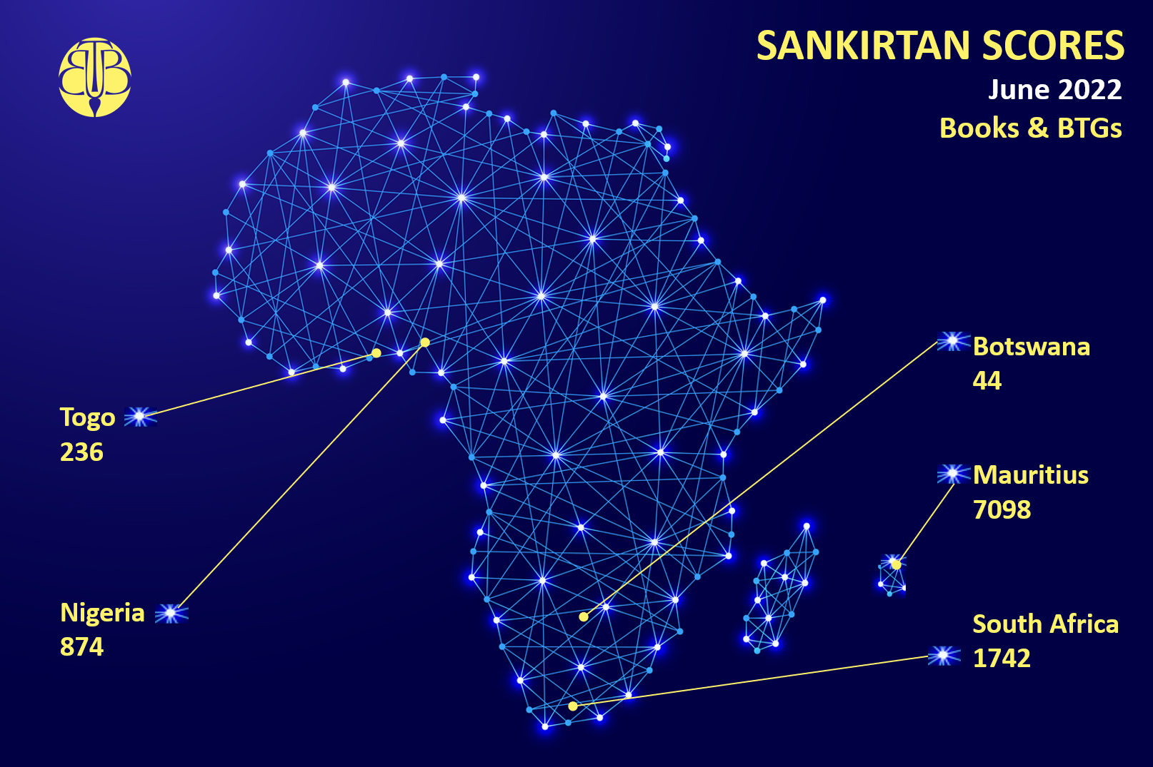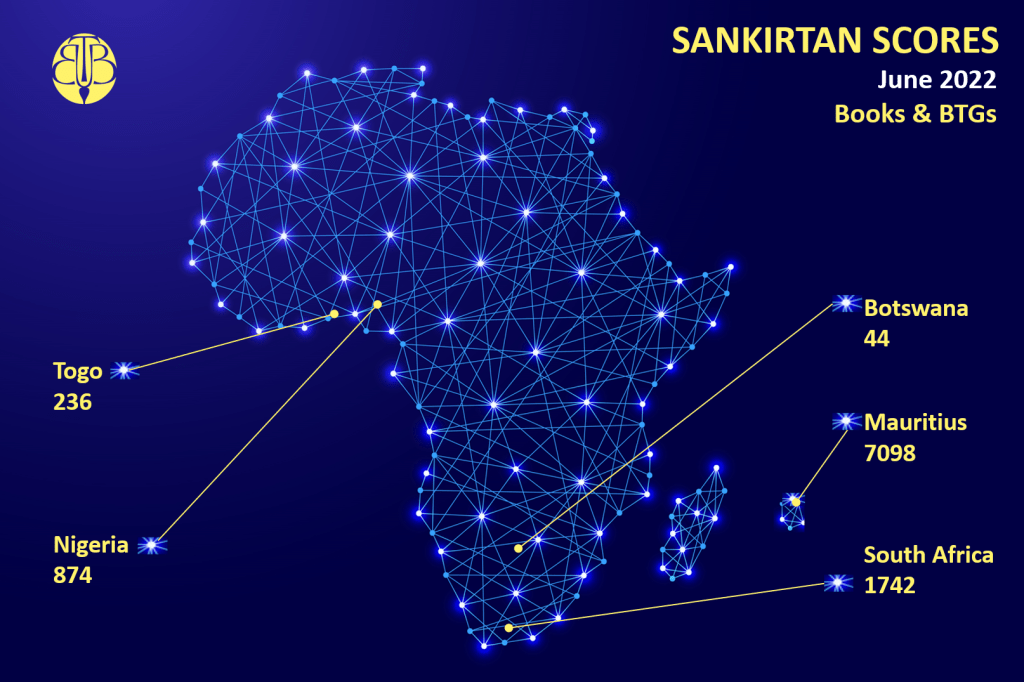 Sankirtana Scores - 2022Africa Sankirtana Scores – June 2022 Dear Devotees, Please find below a summary of the Sankirtana Scores for June 2022 from the African Continent. Please click on the download link for details per temple: Detailed Africa Sankirtana Results – June 2022Download Rate this:Share this: Click to share on WhatsApp (Opens in new window) WhatsApp Click to email a link to a friend (Opens in new window) Email TweetMore Click to print (Opens in new window) Print Click to share on Reddit (Opens in new window) Reddit Share on TumblrLike Loading... Related