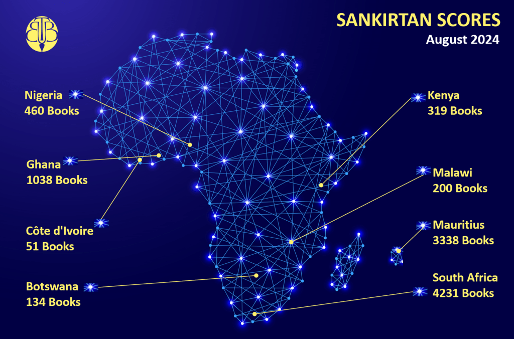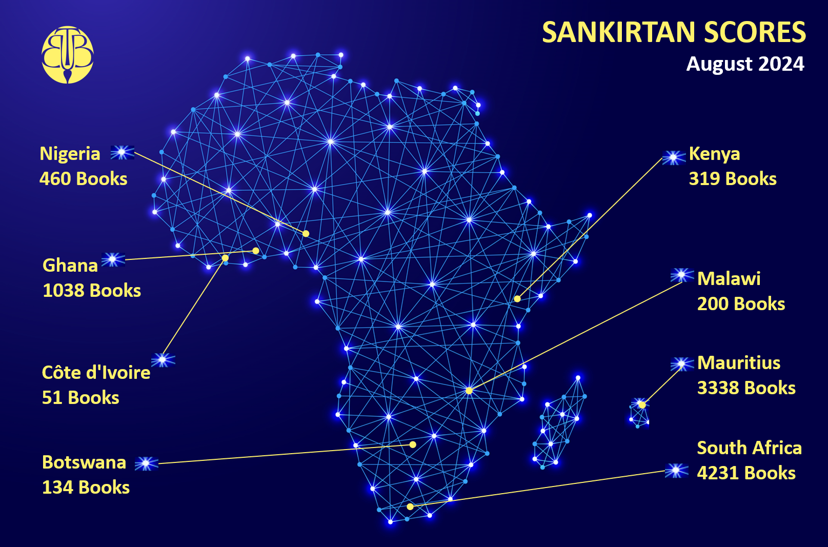 Sankirtana Scores 2024Africa Sankirtana Scores – August 2024 Dear Devotees, Please find below a summary of the Sankirtana Scores for August 2024 from the African Continent. Please click on the download link for details per temple: Detailed Sankirtana results per Temple – August 2024Download Rate this:Share this: Click to share on WhatsApp (Opens in new window) WhatsApp Click to email a link to a friend (Opens in new window) Email TweetMore Click to print (Opens in new window) Print Click to share on Reddit (Opens in new window) Reddit Share on TumblrLike Loading... Related