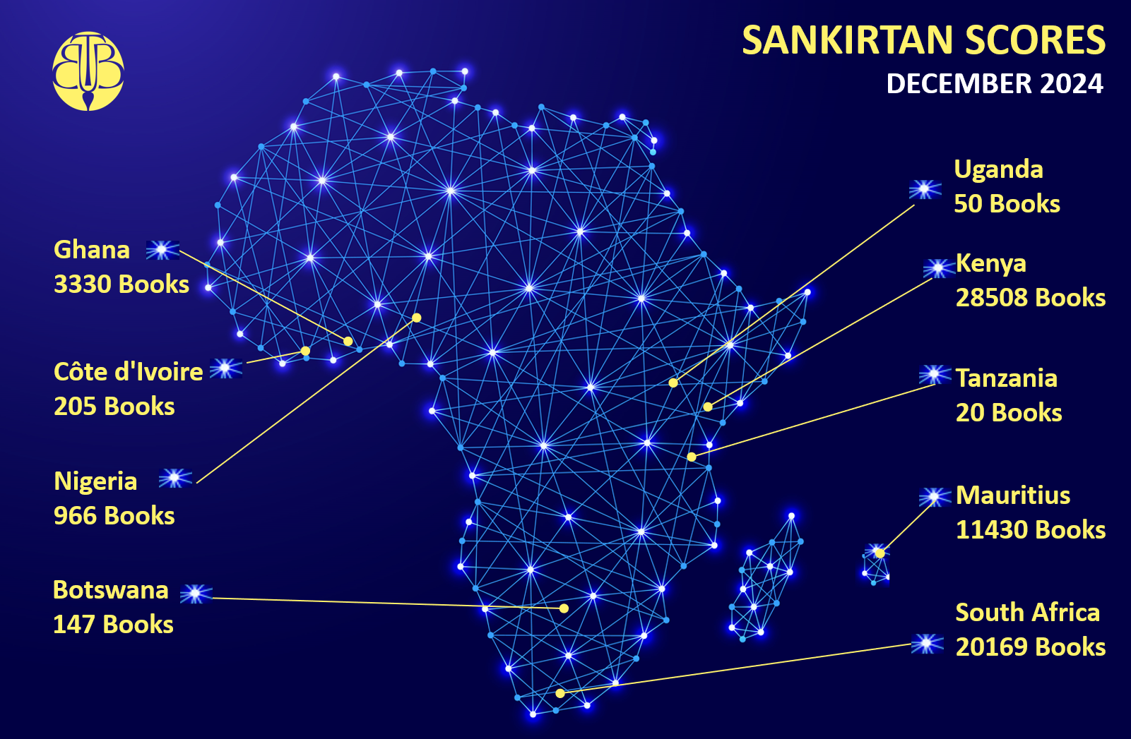 Sankirtana Scores 2024Africa Sankirtana Scores – December 2024 Dear Devotees, Please find below a summary of the Sankirtana Scores for December 2024 from the African Continent. Please click on the download link for details per temple: Africa Book Scores – December 2024Download Rate this:Share this: Click to share on WhatsApp (Opens in new window) WhatsApp Click to email a link to a friend (Opens in new window) Email TweetMore Click to print (Opens in new window) Print Click to share on Reddit (Opens in new window) Reddit Share on TumblrLike Loading... Related