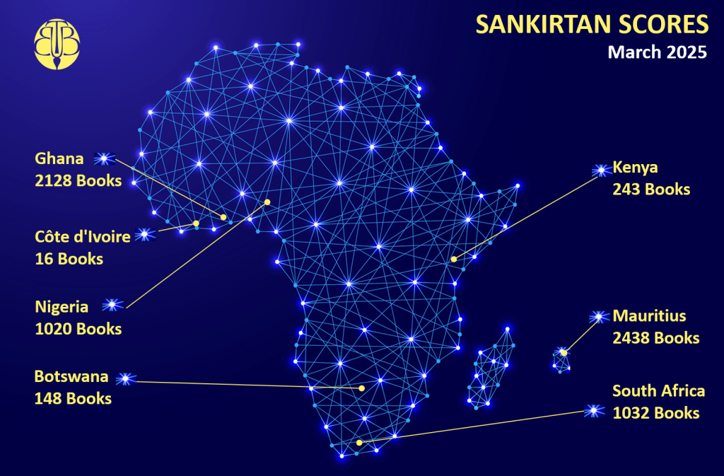 Sankirtana Scores 2025Africa Sankirtana Scores – March 2025 Dear Devotees, Please find below a summary of the Sankirtana Scores for March 2025 from the African Continent. Please click on the download link for details per temple: Africa Book Scores – March 2025Download Rate this:Share this: Click to share on WhatsApp (Opens in new window) WhatsApp Click to email a link to a friend (Opens in new window) Email TweetMore Click to print (Opens in new window) Print Click to share on Reddit (Opens in new window) Reddit Share on TumblrLike Loading... Related