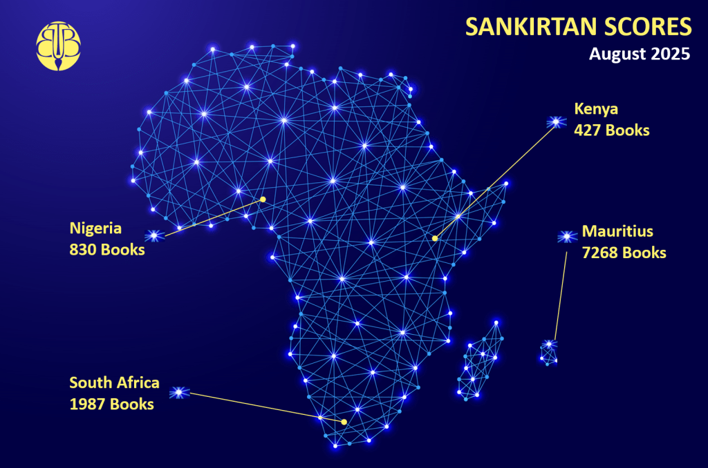 Sankirtana Scores 2025Africa Sankirtana Scores – August 2025 Dear Devotees, Please find below a summary of the Sankirtana Scores for August 2025 from the African Continent. Please click on the download link for details per temple: Africa Book Scores – August 2025Download Rate this:Share this: Click to share on WhatsApp (Opens in new window) WhatsApp Click to email a link to a friend (Opens in new window) Email TweetMore Click to print (Opens in new window) Print Click to share on Reddit (Opens in new window) Reddit Share on TumblrLike Loading... Related