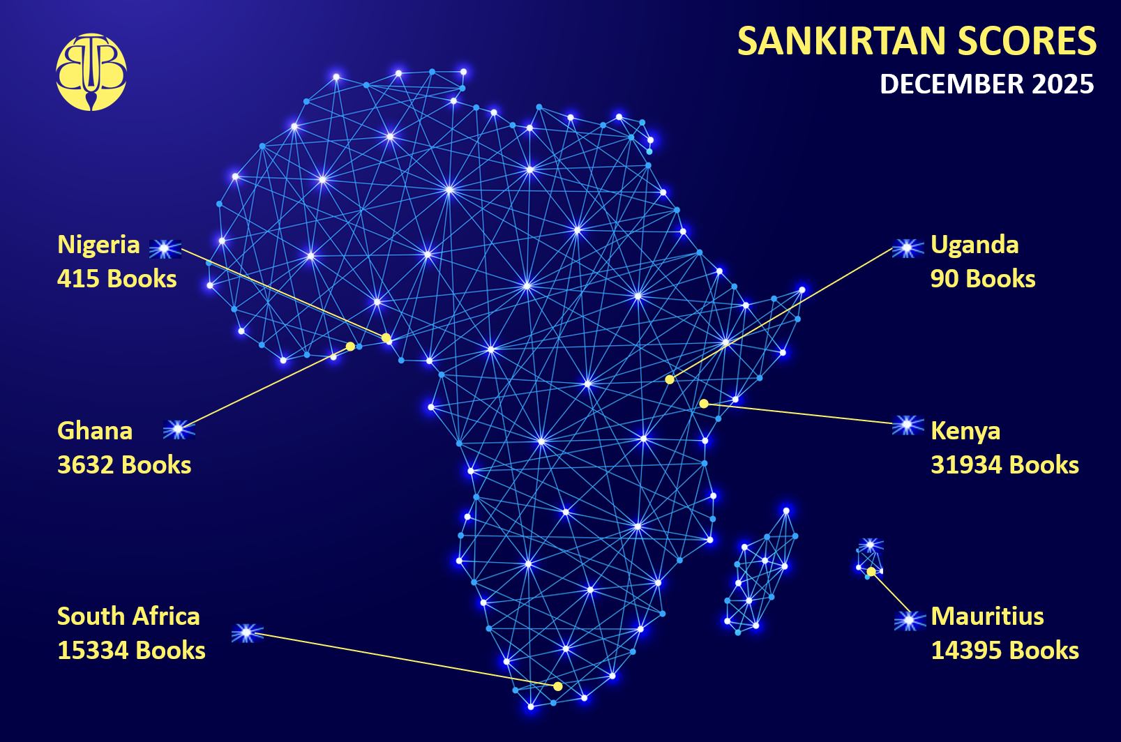 Sankirtana Scores 2025Africa Sankirtana Scores – December 2025 Dear Devotees, Please find below a summary of the Sankirtana Scores for December 2025 from the African Continent. Please click on the download link for details per temple: Africa Book Scores – December 2025Download Scores updated on 31 Jan 2025 due to a late submission. Rate this:Share this: Share on WhatsApp (Opens in new window) WhatsApp Email a link to a friend (Opens in new window) Email TweetMore Print (Opens in new window) Print Share on Reddit (Opens in new window) Reddit Share on TumblrLike Loading... Related