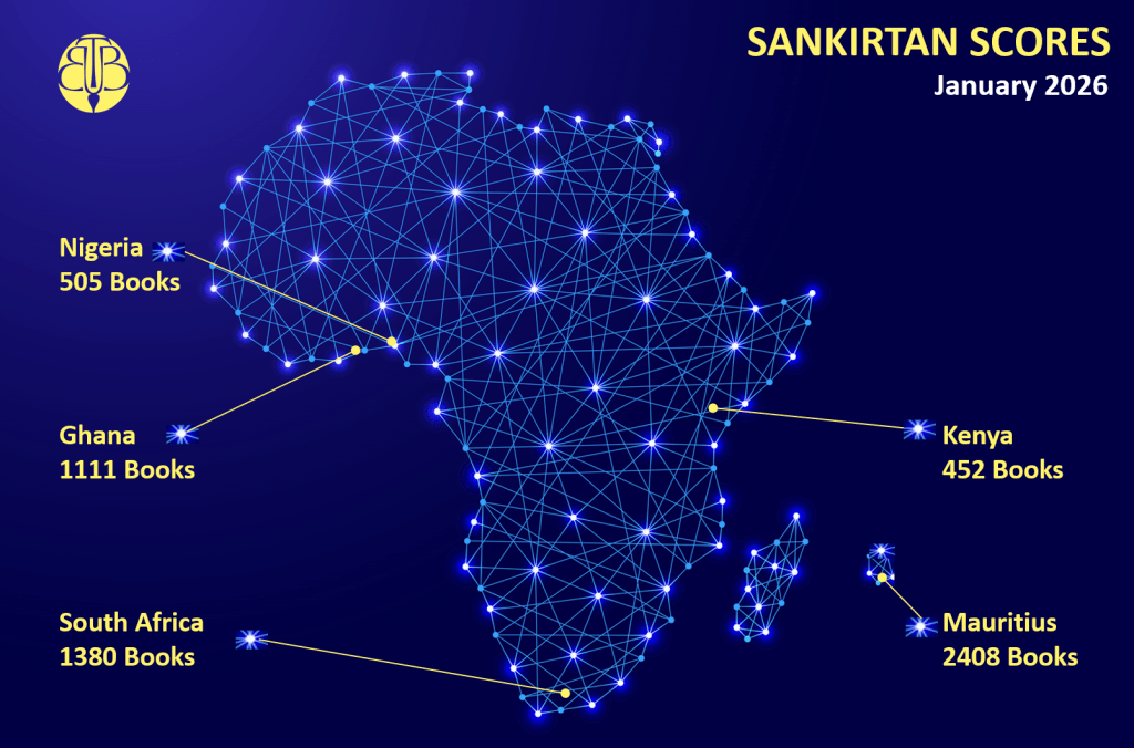 Sankirtana Scores 2026Africa Sankirtana Scores – January 2026 Dear Devotees, Please find below a summary of the Sankirtana Scores for January 2026 from the African Continent. Please click on the download link for details per temple: Africa Book Scores – January 2026Download Rate this:Share this: Share on WhatsApp (Opens in new window) WhatsApp Email a link to a friend (Opens in new window) Email TweetMore Print (Opens in new window) Print Share on Reddit (Opens in new window) Reddit Share on TumblrLike Loading... Related