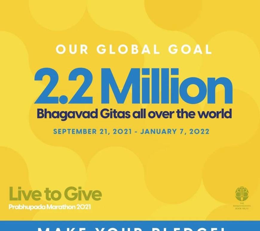 Prabhupada Marathon: Live to Give 2021 The goal for the 2021 Live to Give campaign, also known as the Prabhupada Marathon, was to distribute 2.2 million copies of Bhagavad Gita globally, from 21 September 2021 to 7 January 2022. For the pleasure of Srila Prabhupada, the African Sankirtan Team collectively distributed a total of 14 578 Bhagavad Gitas over the duration of the campaign. The global team … Continue reading LIVE to GIVE 2021