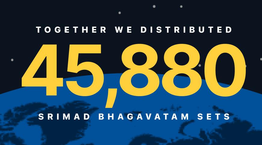 Global The Global team distributed 45,880 sets in 2022! This year, 250+ communities from 50+ countries distributed 45,800 sets of Srimad Bhagavatam, smashing the worldwide goal of 43,000 sets. The long-term goal is to reach 100,000 sets by 2026. Bhadra 2022 – Taking on the burden of responsibility: Bhadra 2022 – Final Scores: Africa The African Sankirtan team far surpassed the goal to distribute 349 Srimad Bhagavatam sets this year. In total, the … Continue reading Bhadra Campaign 2022 – The Results